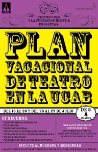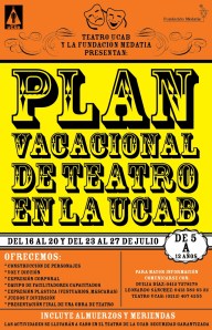 El grupo de Teatro UCAB y la Fundación Medatia presentan el Plan Vacacional de Teatro en la UCAB 2012 dirigido a niños de 5 a 12 años, que se realizará del 16 al 20 y del 23 al 27 de julio, desde las 8:00am hasta las 5:00pm. Las actividades serán llevadas a cabo en las instalaciones del teatro de la UCAB en Caracas, incluye almuerzos y meriendas y todo es dirigido por un equipo de profesionales capacitados y formados en las artes escénicas.
