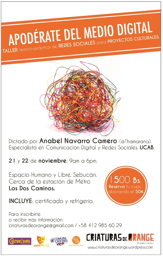 Gracias a la iniciativa de Criaturas de Orange Producciones con el apoyo de Caracas Dos Máscaras y @ComuicadoresVE estaré dando un taller para comunicadores, artistas, creadores, gestores culturales y a todas aquellas personas relacionadas al medio artístico y cultural, en el que me encantaría me acompañaran.