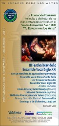 Al medio día, la Fundación Fonbienes presenta el III Festival Navideño Ensamble Vocal Siglo XXI, el evento reunirá un total de 50 voces junto a “Los Trovadores Dorados”, y el “Ensamble Vocal Clínica Santa Sofía”, todos bajo la dirección musical del pianista Fernando Roa. Actuarán también como invitados especiales: César Arrieta y Julio Daantje (tenores), la soprano Ninoska Camacaro y en la percusión, Nathalie Álvarez y Mariela Suárez. Esto es desde las 12:30m en el Salón Siglo XXI en Los Dos Caminos.
